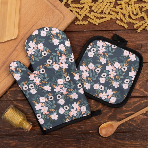 Кухонный набор 2 прихватки Доляна Цветочки , прихватка 17х17 см, варежка 24х18 см, 100% п/э