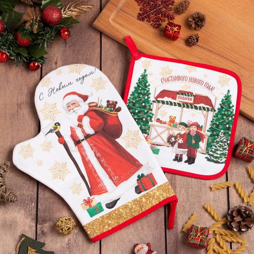 Набор кухонный Новогодняя ярмарка: варежка-прихватка 20х28см, прихватка 19х19см,100%хл