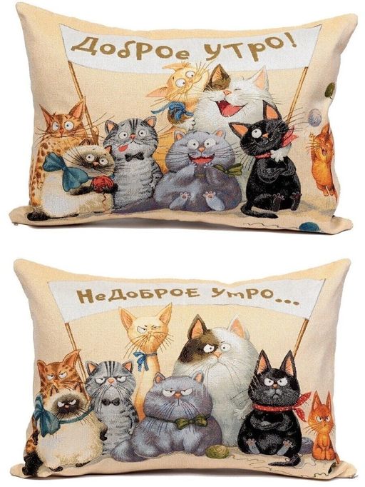 Доброе-Недоброе утро Кошки-Двусторонняя гобеленовая наволочка 45х63см