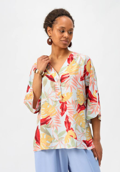 Артикул: Блуза с тропическим принтом свободного кроя светло-голубой