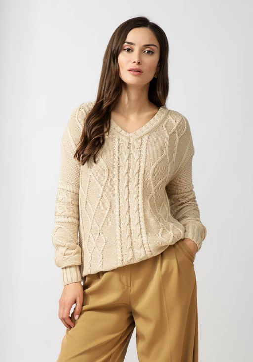 Артикул: Джемпер женский с рисунком косы и араны жемчужный