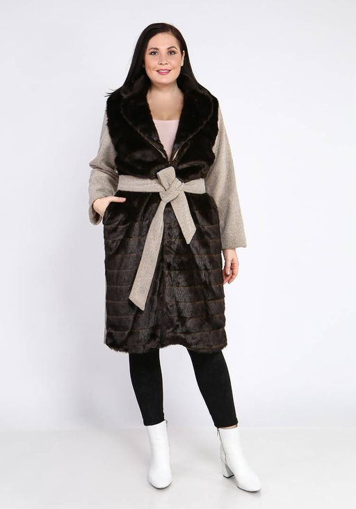 Артикул: Пальто с отделкой из меха и поясом коричневый