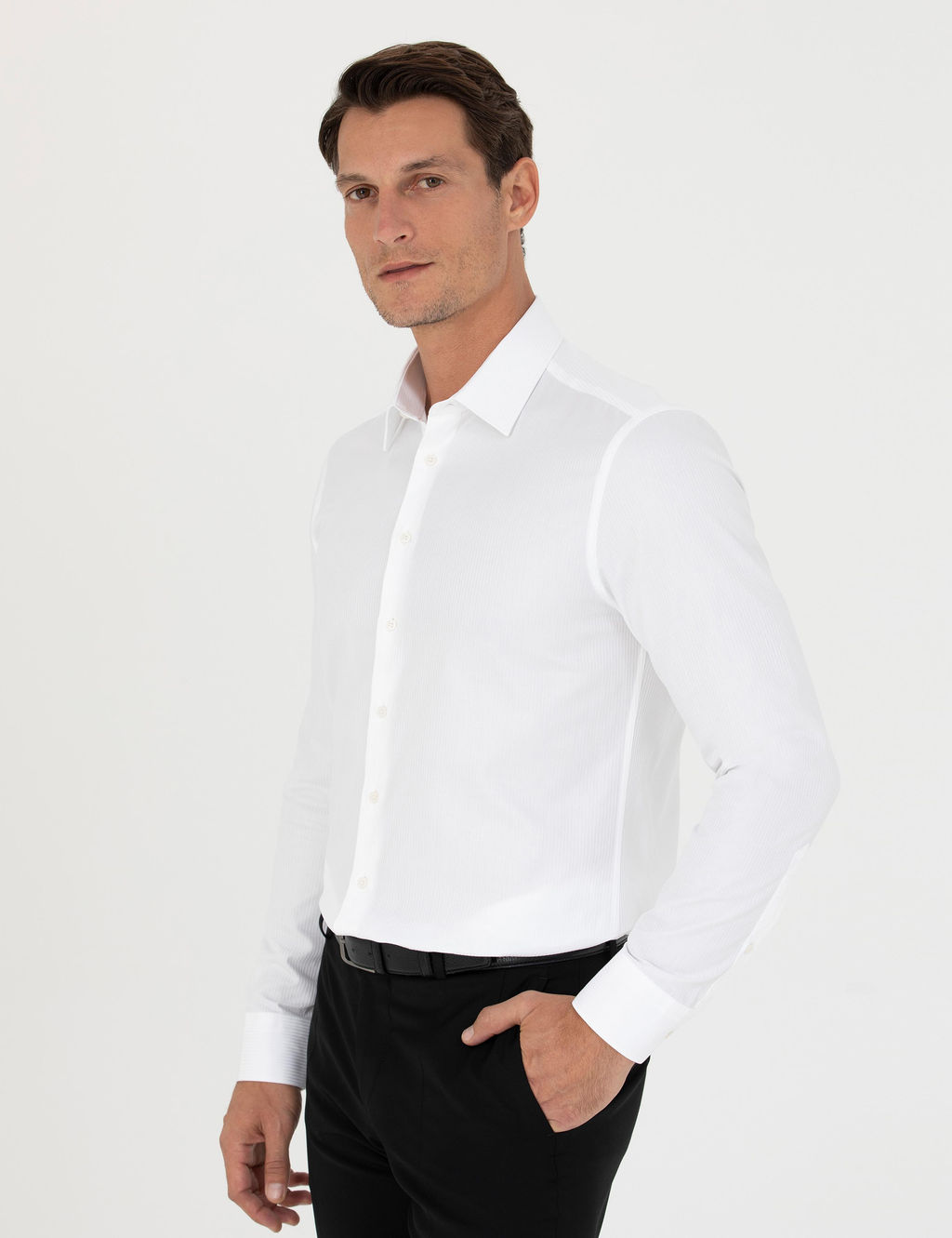 Белая приталенная рубашка с длинным рукавом