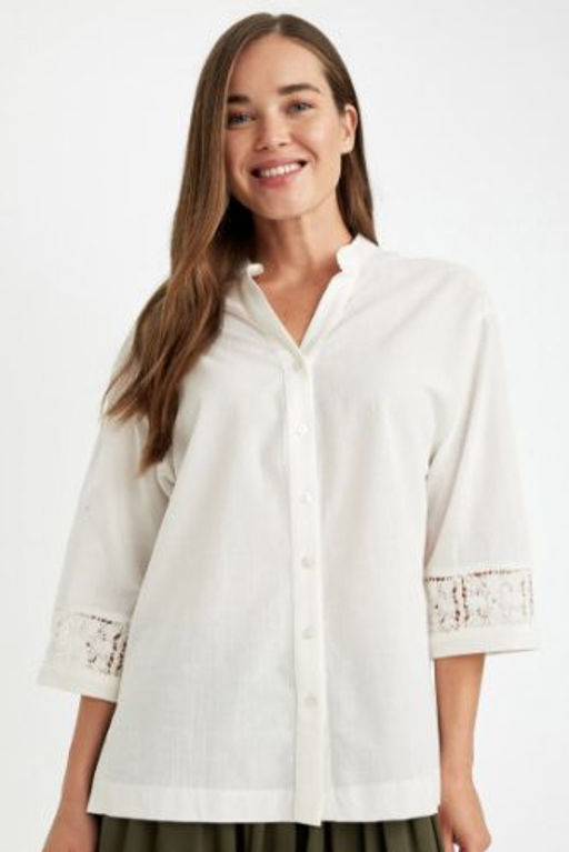 Relax Fit Apas Yaka Basic Duz Kol Ucu Dantelli Yar?m Kollu Gomlek