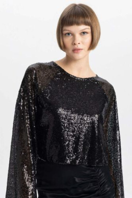 Crop Yuvarlak Yaka Payetli Kumas Uzun Kollu Bluz