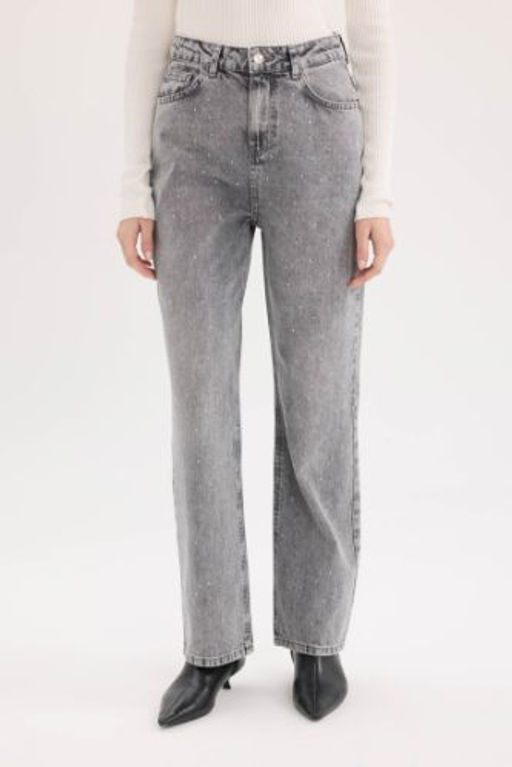 Straight Fit Yuksek Bel Bilek Boy Tasl? Jean Y?kamal? Pantolon