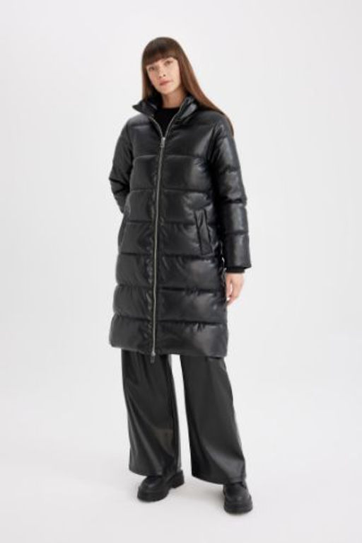 Su Itici Uzun Sisme Mont Parka Oversize Genis Kal?p Dik Yaka Fermuarl? Suni Deri