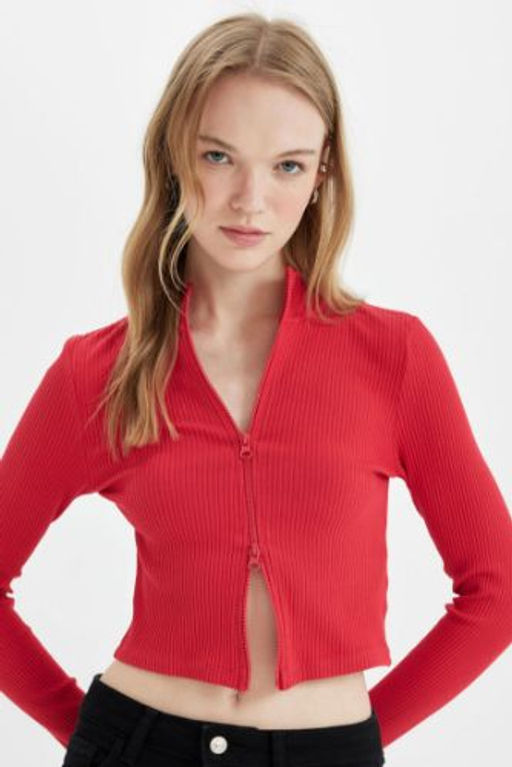 Fitted Dik Yaka Basic Duz Fermuarl? Fitilli Kaskorse Crop K?rm?z? H?rka