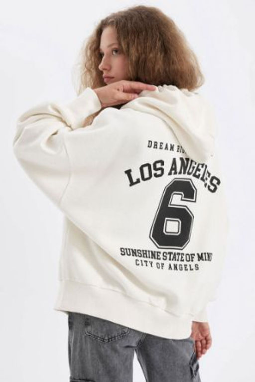 Oversize Genis Kal?p Kapusonlu S?rt Bask?l? Kal?n Fermuarl? Sweatshirt