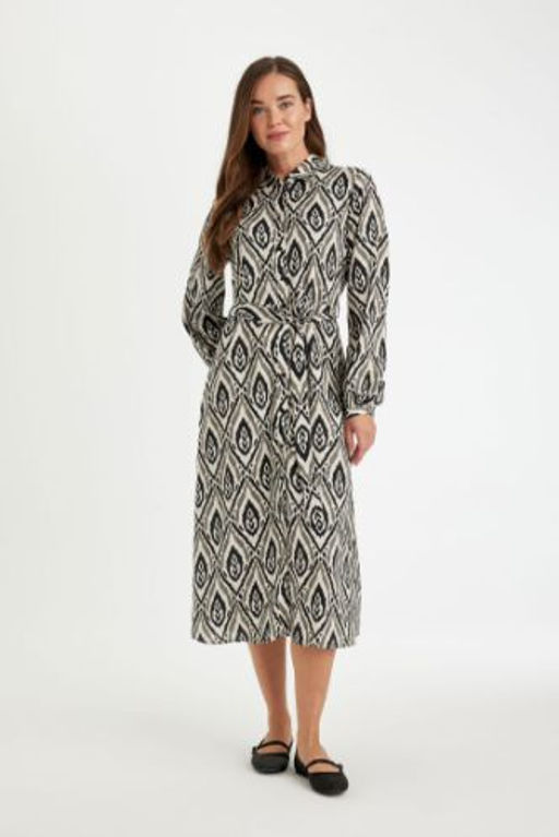 Gomlek Yaka Etnik Desenli Dugmeli Kemerli Uzun Kollu Maxi Elbise