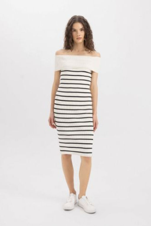 Fitted Cizgili Ac?k Omuz Triko Midi Elbise