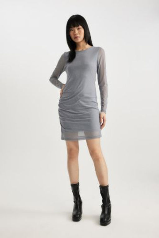 Bodycon Vucudu Saran Basic Duz Bisiklet Yaka Tul Uzun Kollu Mini Elbise