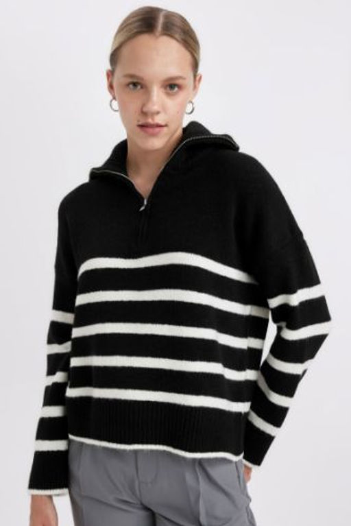 Oversize Genis Kal?p Cizgili Yar?m Fermuarl? Dik Yaka Triko Kazak