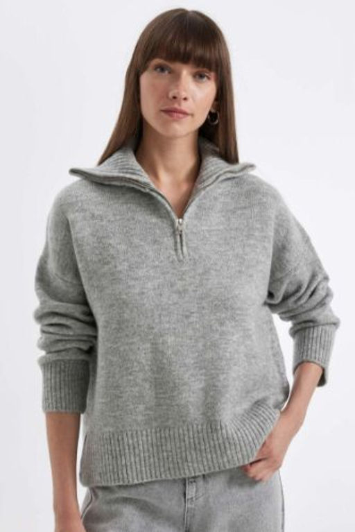 Oversize Genis Kal?p Yar?m Fermuarl? Dik Yaka Triko Kazak