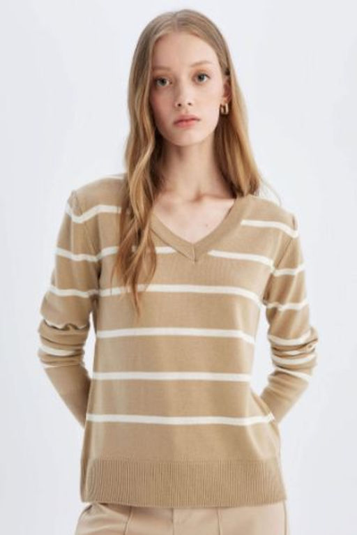 Relax Fit V Yaka Yumusak Dokulu Cizgili Triko Kazak