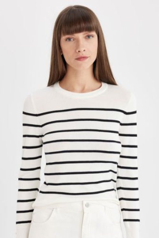 Regular Fit Yumusak Dokulu Bisiklet Yaka Cizgili Triko Kazak
