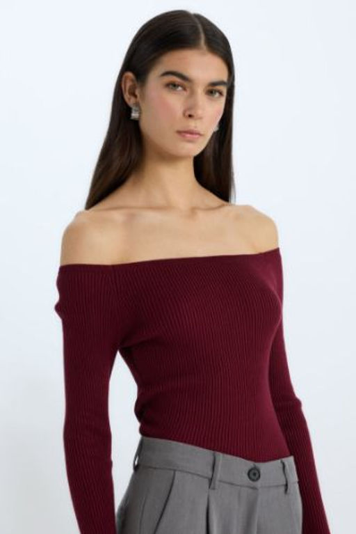 Fitted Ac?k Omuz Basic Duz Bordo Triko Kazak