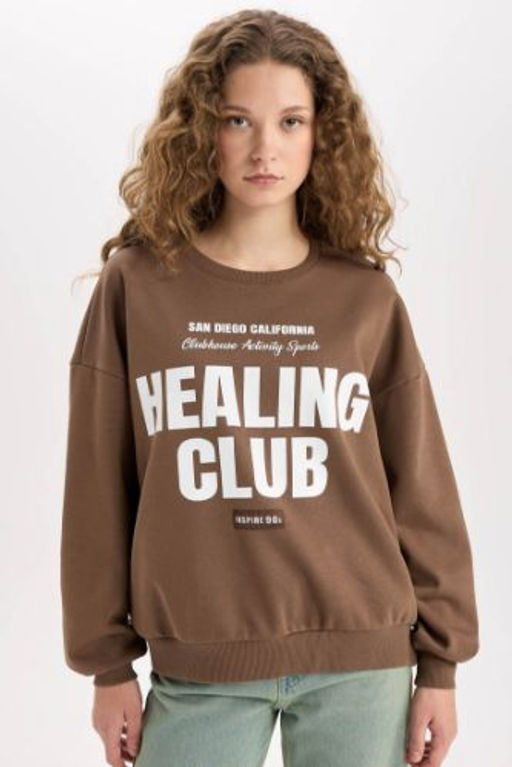 Loose Fit Bisiklet Yaka Bask?l? Kal?n Sweatshirt