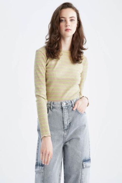 Fitted Bisiklet Yaka Cizgili Uzun Kollu Tisort