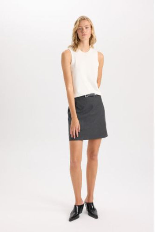 A Kesim Basic Duz Yuksek Bel Kemerli Mini Klasik Etek