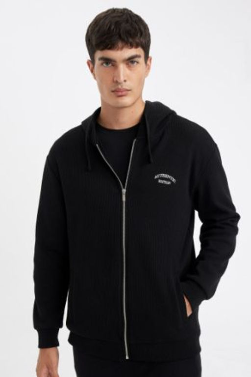 Siyah Relax Fit Kapusonlu Waffle Bask?l? Cepli Fermuarl? Sweatshirt