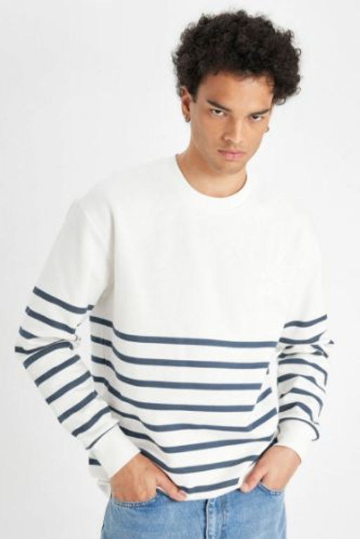 Comfort Regular Fit Rahat Kal?p Bisiklet Yaka Cizgili Kal?n Sweatshirt