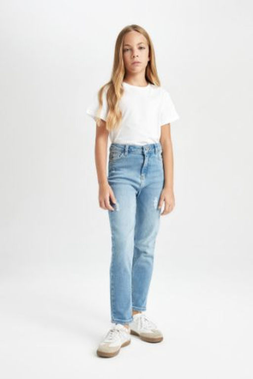 K?z Cocuk Skinny Fit Y?rt?k Detayl? Dar Paca Cepli Jean Pantolon