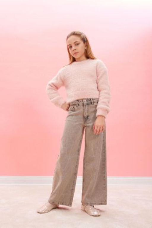K?z Cocuk Y?lbas? Temal? Wide Leg Genis Paca Jean Pantolon
