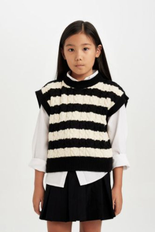 K?z Cocuk Cizgili Bisiklet Yaka Orgu Desenli Triko Suveter