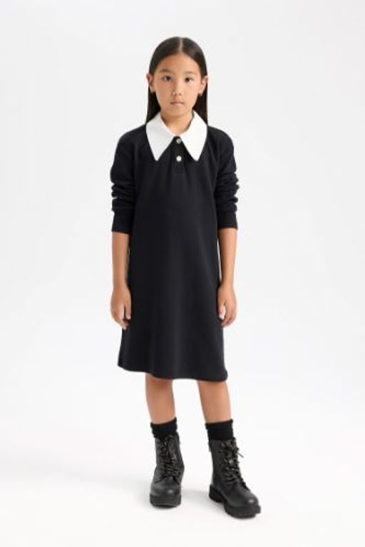 K?z Cocuk Gomlek Yaka Basic Duz Uzun Kollu Siyah Elbise