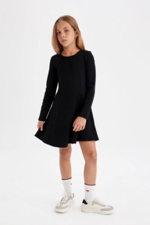 K?z Cocuk Siyah Basic Duz Bisiklet Yaka Fitilli Kaskorse Uzun Kollu Elbise