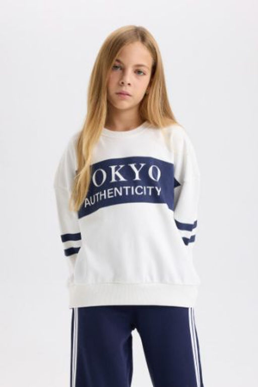 K?z Cocuk Oversize Genis Kal?p Bisiklet Yaka Bask?l? Sweatshirt