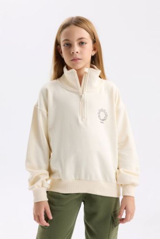 K?z Cocuk Relax Fit Dik Yaka Yar?m Fermuarl? Bask?l? Sweatshirt