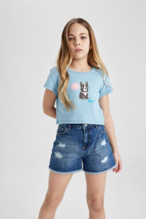 K?z Cocuk Bisiklet Yaka Bask?l? Ribana K?sa Kollu Tisort