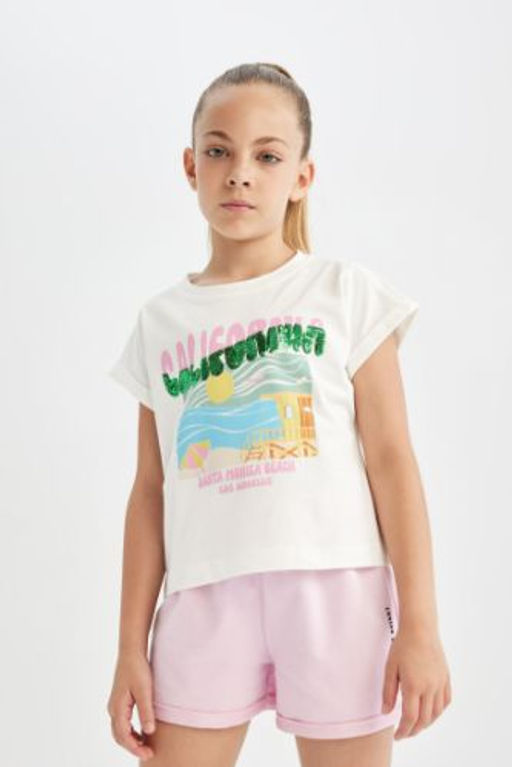 K?z Cocuk Boxy Fit Bisiklet Yaka Tropikal Desenli K?sa Kollu Tisort