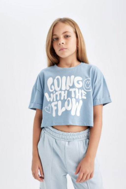 K?z Cocuk Crop Bisiklet Yaka Bask?l? K?sa Kollu Tisort