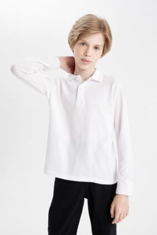 Erkek Cocuk Polo Yaka Basic Duz Pike Uzun Kollu Beyaz Okul Tisortu