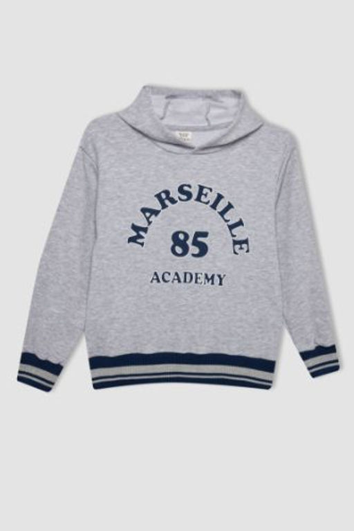 Erkek Cocuk Gri Yaz? Bask?l? Kapusonlu Kal?n Sweatshirt
