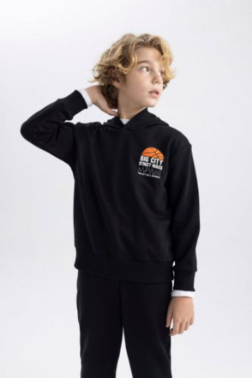 Erkek Cocuk Bask?l? Kapusonlu Kal?n Sweatshirt