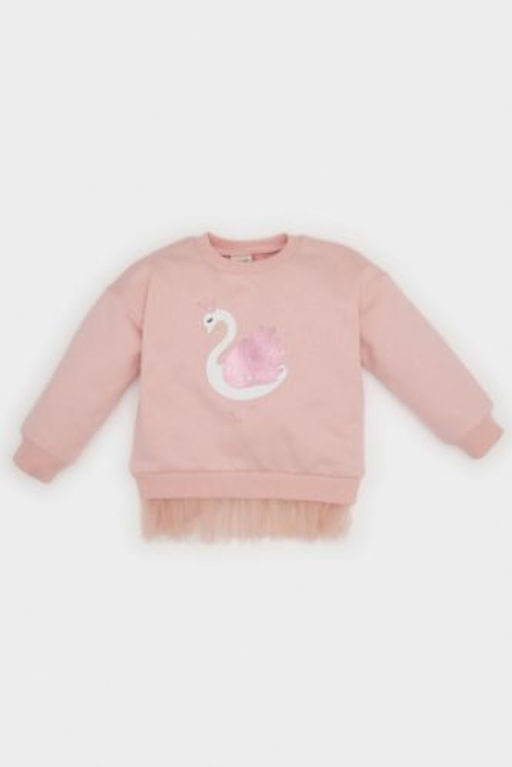 K?z Bebek Bisiklet Yaka Bask?l? Ici Yumusak Tuylu Etek Ucu Detayl? Sweatshirt