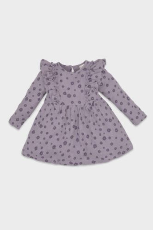 K?z Bebek Cicekli Uzun Kollu F?rf?rl? Waffle Mor Elbise