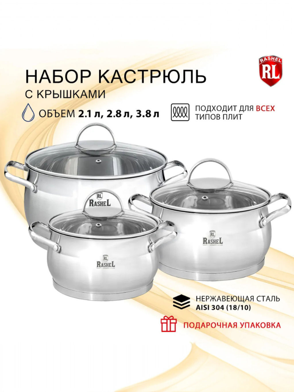 Набор кастрюль R-207А 6 предметов из нержавеющей стали со стекл. кр. 2.1л, 2.8л, 3.8л /RASHEL