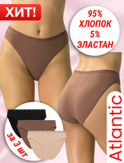 ATLANTIC 3CLP-010 Трусы спорт с высокой посадкой High Sport Leg - набор 3 шт. черный + светлый капучино + светло-бежевый