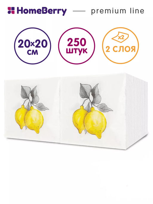 Салфетки бумажные "Art Bouquet" 20х20см, 2-х слойные, 250 штук в упаковке, 100% целлюлоза, "Лимончики" (Россия)