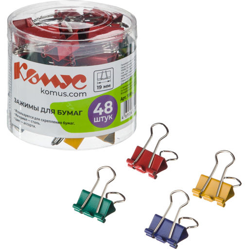 Зажимы для бумаг 19мм 48шт./уп. Комус цветные, в пласт. боксе