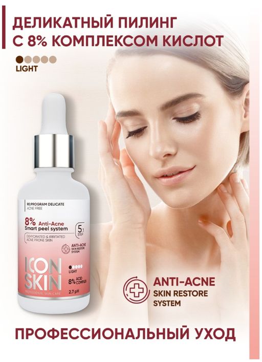 Деликатный пилинг для лица с 8% комплексом кислот. Для проблемной, склонной к сухости кожи. 30мл