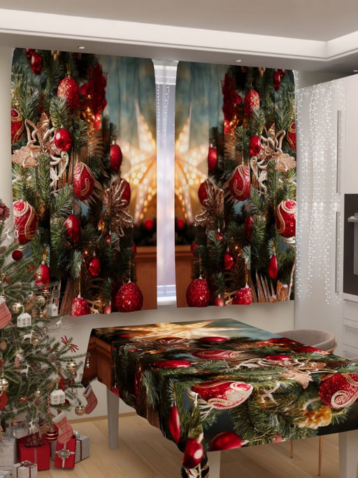 Фотошторы для кухни Новогодняя коллекция 157 Шторы (Габардин)+Скатерть (145*200)