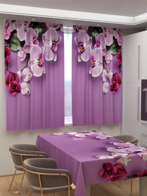 Фотошторы для кухни Сиреневые орхидеи Фотошторы ткань Габардин