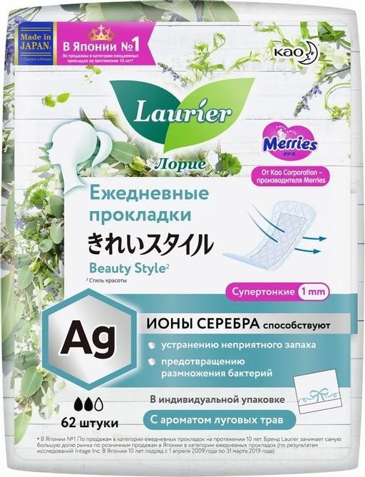 Laurier Beauty Style Женские гигиен. прокладки на кажд. день с ионами серебра с аром. луг.трав 62шт