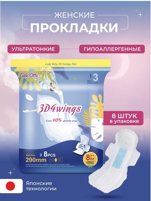 Ночные прокладки с крылышками Lady Kitty 290 мм 8 шт 6 капель